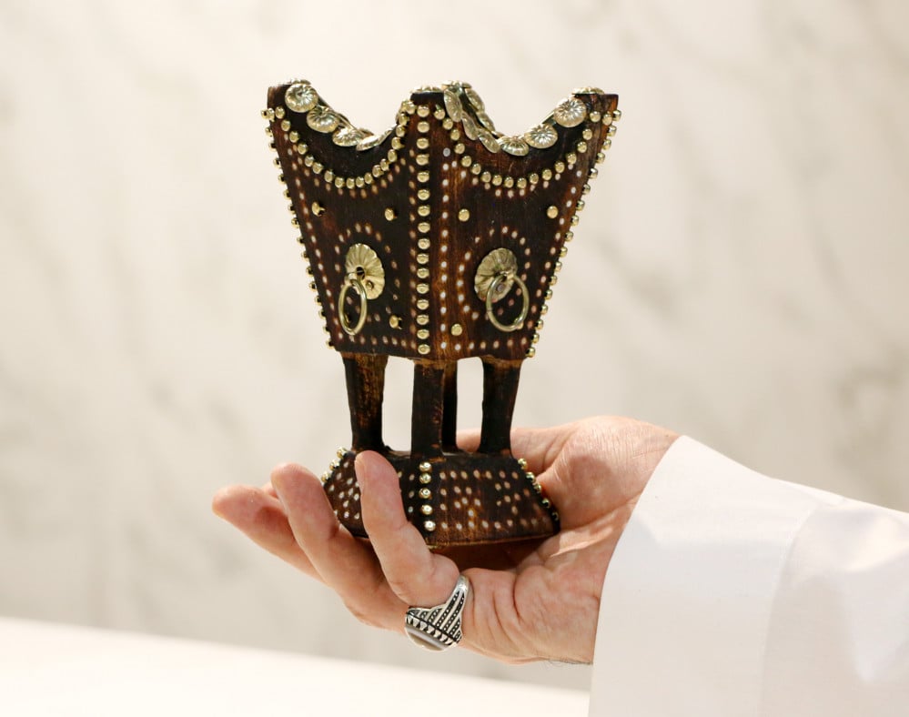 مبخره مميزة من خشب الأثل الناشف يتم نحتها ورشمها بالمسامير التجميليه يدويآ حتى تصبح قطعه واحده غير مجزأة